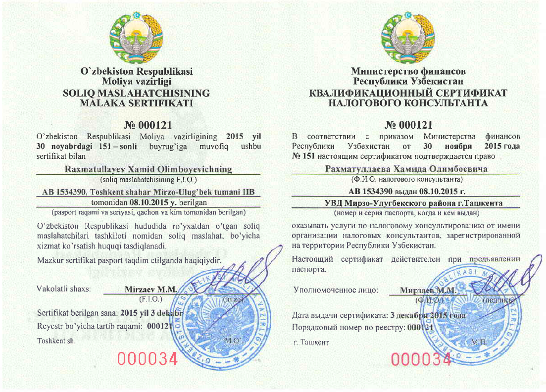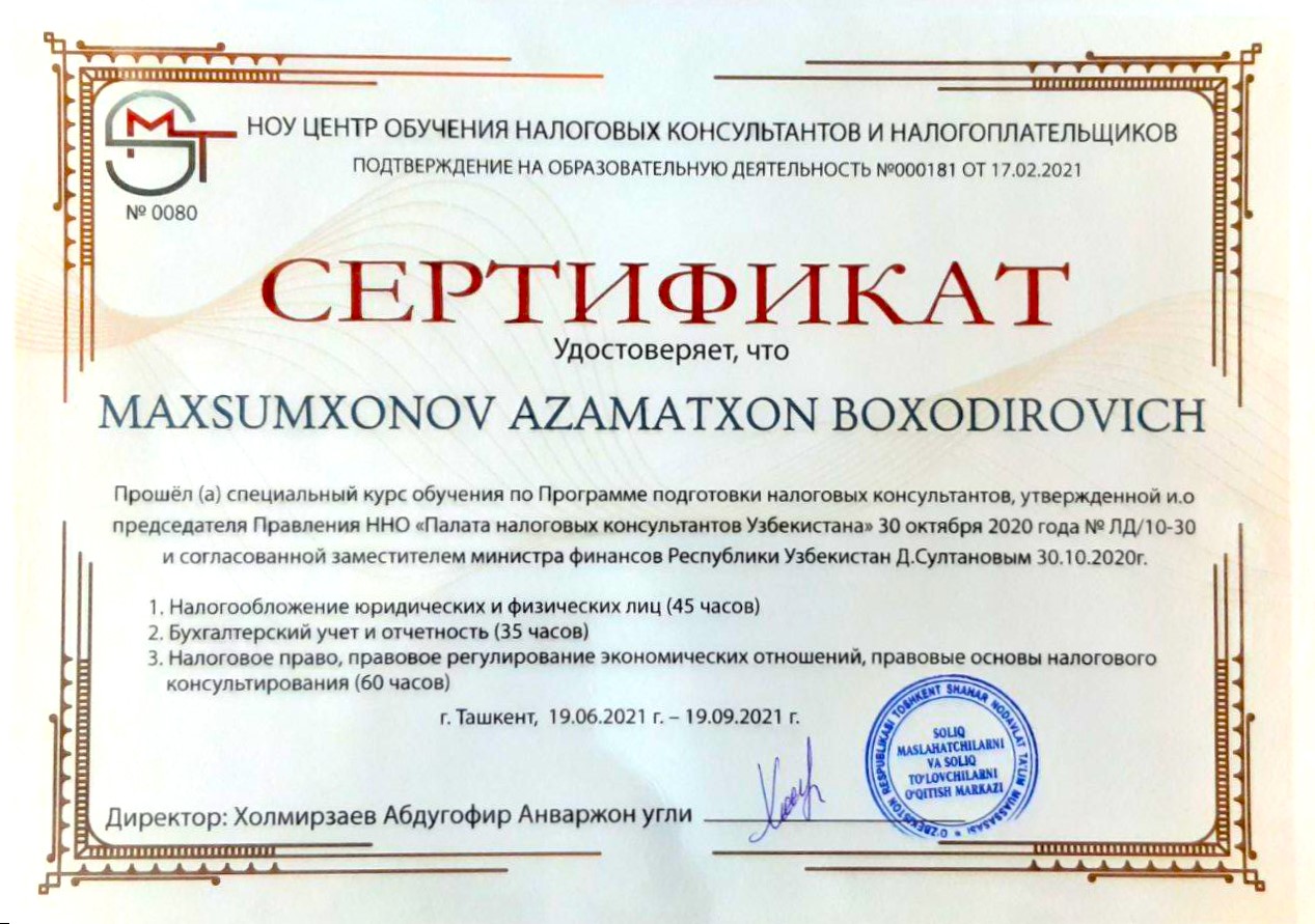Мы специалисты по налогам, который помогаем клиентам минимизировать свои налоговые обязательства и увеличить свои сбережения. Предоставляют услуги Аудиторская организация "SMART CONTROL", Организация налоговых консультантов "MULTI TAX SERVICE", Бухгалтерская фирма ООО "HISOB-KITOB".